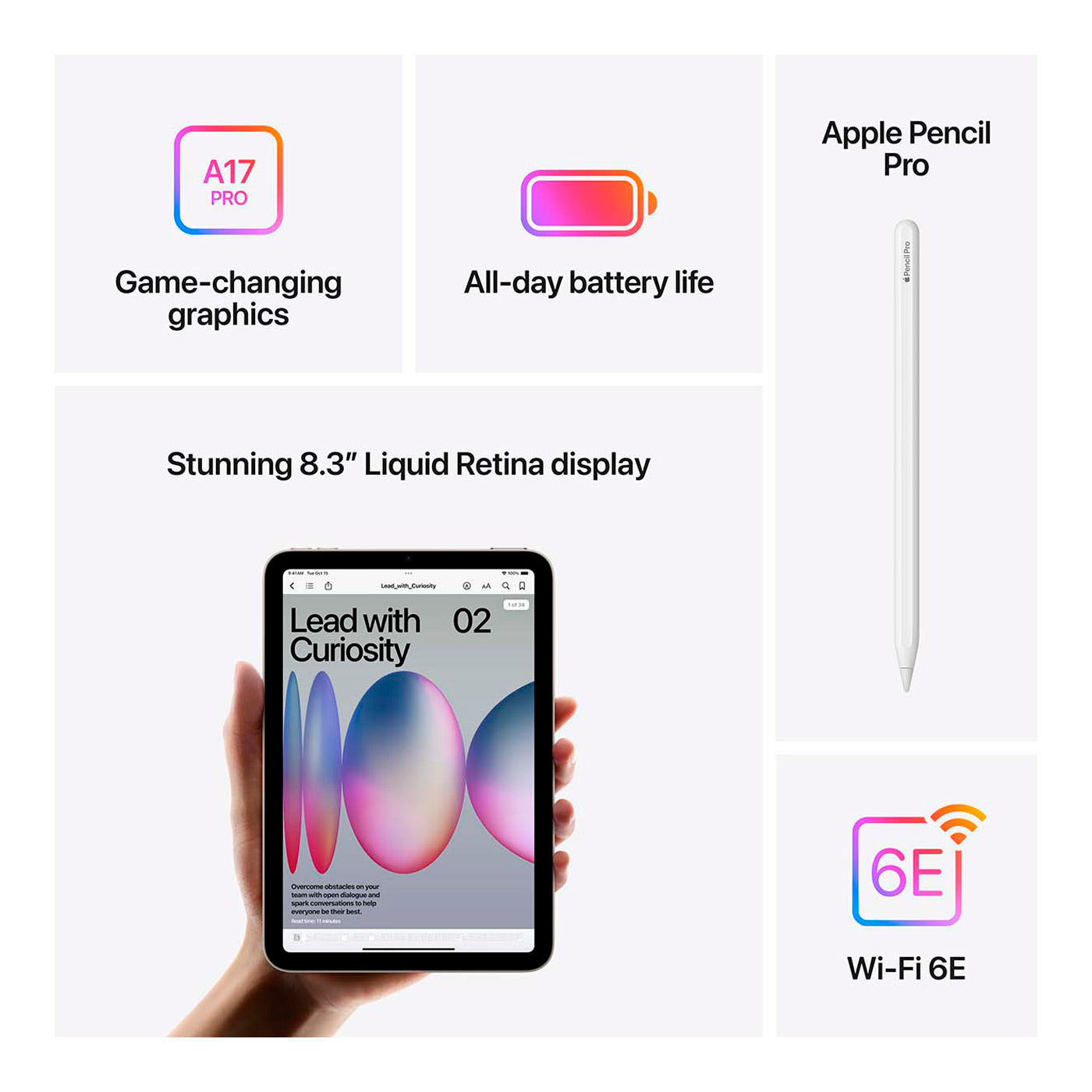 iPad Mini 2024 leverer en skarp og levende oplevelse på sit 8,3 tommer Liquid Retina display, hvor farver og lysstyrke gør den oplagt til både serier, studier og kreative projekter med Apple Pencil. Opløsningen på 2266 x 1488 pixels giver et flot detaljeret billede, og selv med en opdateringshastighed på 60 Hz føles navigation og apps behageligt responsivt. Indeni arbejder A17 Pro chippen sammen med 8 GB RAM, så alt fra spil til mails glider problemfrit, og du kan vælge mellem 128, 256 og 512 GB lagerplads alt efter behov.