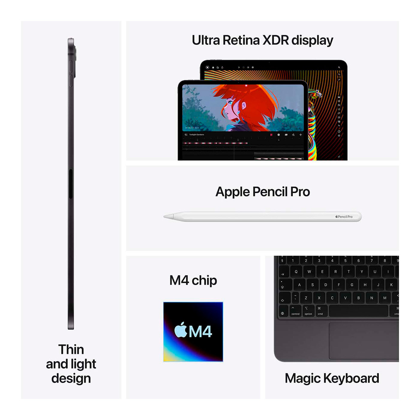 Kameraopsætningen består af en 12 MP vidvinkelsensor med f/1.8-blænde bagtil, der sikrer skarpe billeder og video, mens den landskabsorienterede 12 MP ultravidvinkel på fronten gør videomøder og FaceTime-opkald mere naturlige. Center Stage holder dig automatisk i billedet, og LiDAR-scanneren åbner for præcis AR-brug. Fire mikrofoner i studiekvalitet og et kraftigt firespeaker-system skaber en lydoplevelse, der imponerer i både præsentationer, film og musik. Det hele kører gnidningsfrit med iPadOS 17, Face ID, Wi-Fi 6E og Bluetooth 5.3, så du kan arbejde stabilt og effektivt uanset hvor du befinder dig.